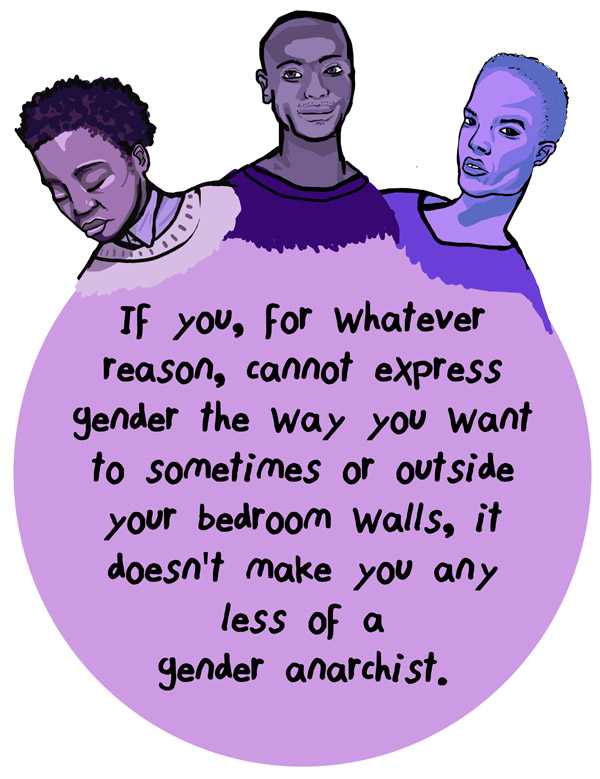 Being out and proud, making sure people know about your genderfluidity and genderfuckery is great activism for trans peoples and gender outlaws and a great feeling for many. But if you, for whatever reason, cannot express gender the way you want to sometimes or outside your bedroom walls, it doesn't make you any less of a gender anarchist. Remember that regardless of who knows of your gender identity and regardless of what people see, you will always still be you.