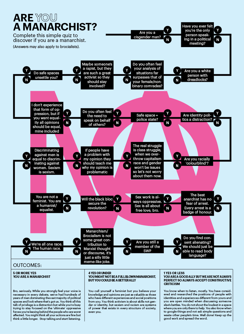 The Manarchist knows that activism was invented by white men. Ideas are the original work of past bros, and history a procession of them. Anarchism, socialism, communism, these labels describe a tradition of male genius. In the past some women (Emma Goldman, Rosa Luxemburg, Rosa Parks) had good ideas. In the present, women’s good ideas approximate to fascism: safer spaces policies are for babies, meetings without white men are reverse racism, community accountability is a witch-hunt. The Manarchist does not see any irony in claiming men are being witch-hunted. These days it is so hard for a man to even speak without being silenced.