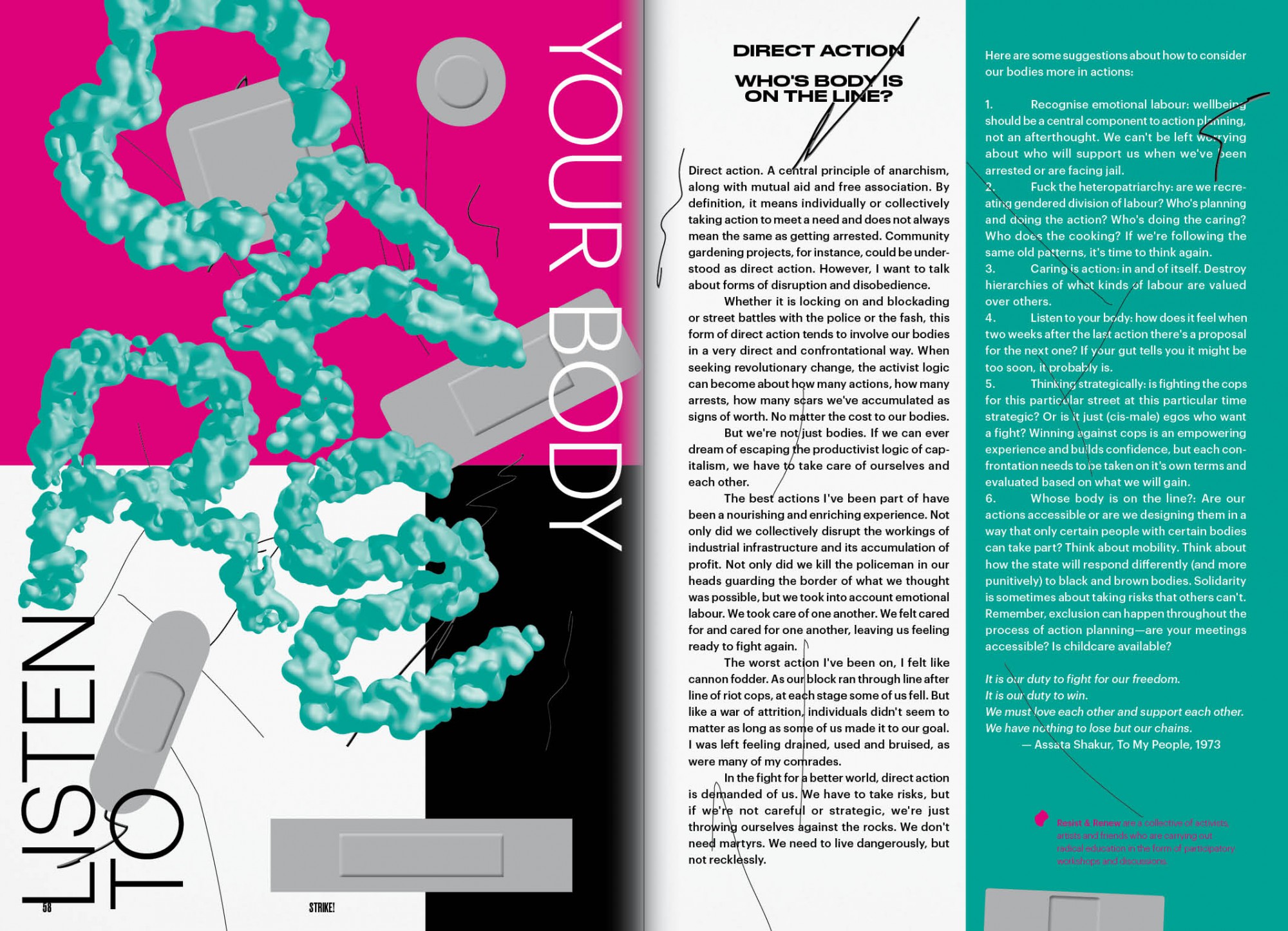 Here are bodies that are overworked, stigmatised, and feared. Denied access at borders, controlled and de-legitimized by reductive legislation; these bodies endure the full array of state forces. Restrained by dominant definitions of the ‘acceptable body’, erased by common consensus, reduced to the minimum dimensions or calorie requirements needed to maximise profit; the body is a battleground of desire. Here are bodies that are loving, excessive, and refuse to be censored. By listening to and protecting one another, the collective body is strengthened. These bodies preserve and retell their stories, transcending prevailing narratives—together they educate, diagnose and heal themselves, generating an inclusive body knowledge. These bodies invite you to take action to transform the landscape of representation. Here are bodies that create their own hope. From tooling up to protect our data bodies, to rendering the violence done to bodies en masse, this issue looks to explore concepts of ‘the body’ in an expanded sense.